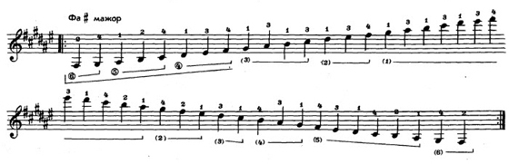Более подробное описание исполнения гамм в разделе «Самоучитель. Урок игры на гитаре №19», где более подробно описываются движения пальцев на примере исполнения гаммы до мажор.